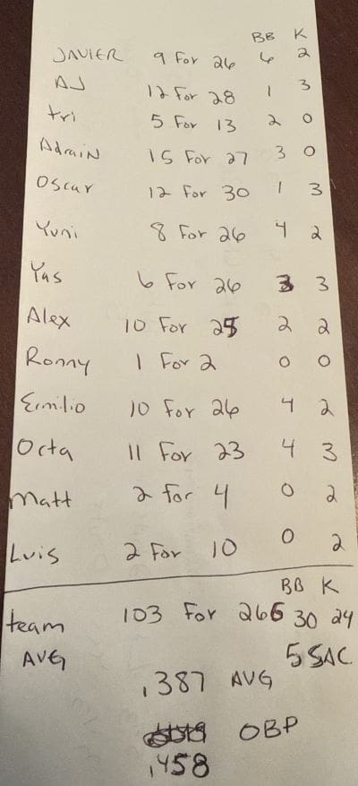 In the playoffs, Ace Yasmany Hernandez threw 14 1/3 innings, surrendering 0 earned runs and allowing only five hits. Luis Mendoza contributed 14 2/3 innings, giving up only two earned runs. We were able to ride them through the quarters, semis, and championship games. The two of them combined for a 2-hit shutout in the Championship Game against the Thunder.