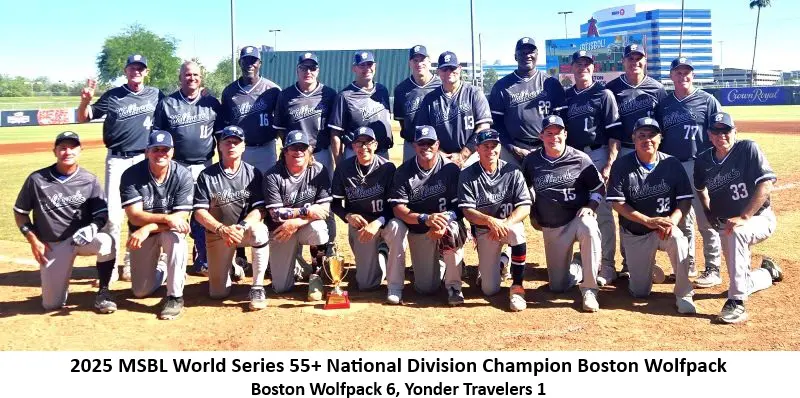 2025 World Series logo, Tempe, Arizona.The Boston Wolfpack won the 55+ National division of the 2025 MSBL World Series with a victory over the Yonder Travelers, 6-1.  The Pack was led by MVP Urbano Leal, who pitched 7 2/3 innings, giving up one run and seven hits while striking out seven.