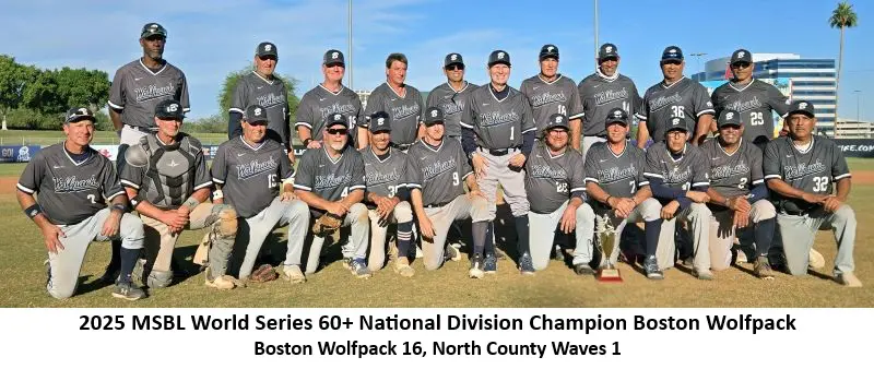 The Boston Wolfpack celebrated their 25th Anniversary by winning their second consecutive 60+ National MSBL World Series over the North County Waves, 16-1. The Pack lost twice to the Waves in pool play but finally were able to defeat them in the Championship. Boston got strong and consistent hitting all week from MVP Jose Delgado, who got on base 22 times for the week, four times in the final, including a double.