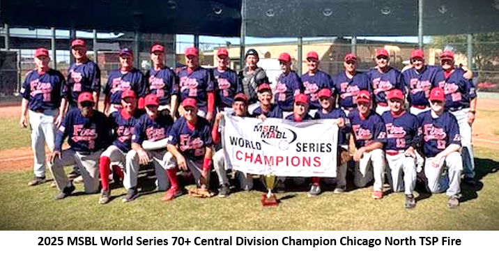 2025 World Series logo, Tempe, Arizona.The 2025 edition of the Chicago Fire 70’s faced some adversity during pool play. Bob Buffa, one of our starting pitchers/infielders, had to stay back home with a medical issue, and our field general behind the plate, Ron Oates, broke his hand during a play at the plate on Wednesday. Despite these two setbacks, we were still able to finish pool play with a 3-2 record.