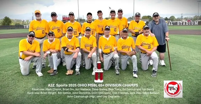 The A 2 Z Athletics won the 2025 65+ championship game of the Ohio Men’s Senior Baseball League in Canton, Ohio, with a score of 10-0 over the Classics. We went 14-2 this season, after moving up from the 60+ division, where we won the championship in seven out of the nine years we participated.