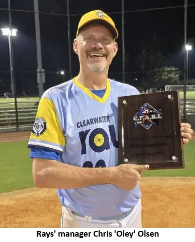 Player/Manager Chris “Oley” Olsen and third-base Coach/PH David “Turtle” Dolgin guided the Rays to a first-place finish with an 8-2-1 record.