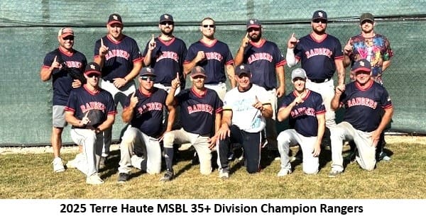 The Rangers captured the 35+ League Championship of the Terre Haute Men’s Senior Baseball League last weekend. They collected 17 runs over 17 hits and outlasted the runner-up Braves 17-6.