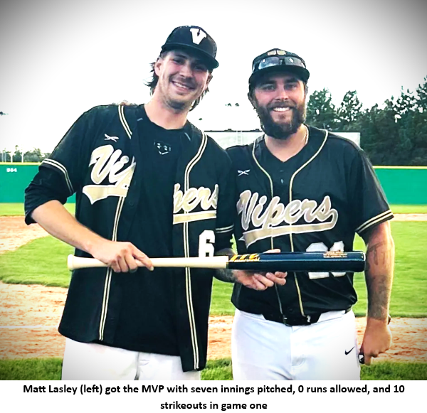 Lasley earned the win for the Vipers. The starting pitcher gave up five hits and zero runs over seven innings, striking out 10 and walking two. Hunter Crisp took the loss for Bombers.