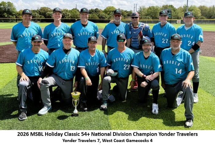 The 54+ Yonder Travelers delivered a memorable championship performance at the 2026 MSBL Holiday Classic in Sanford, Florida, finishing the week with an outstanding 5-0-1 record and capturing the title against one of the deepest and most talented divisions the tournament has seen in recent years.
