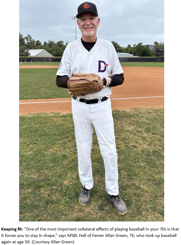 “One of the most important collateral effects of playing baseball in your 70s is that it forces you to stay in shape,” Green says. “I’m sure I wouldn’t keep up my stretching and conditioning if I weren’t playing baseball. People think it’s dangerous, but I’m actually healthier because I’m playing — titanium hip and all.”