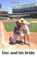 A high point of this octogenarian’s MSBL involvement was throwing out the first pitch at a tournament in Oakland Stadium, then home of the Oakland A’s, with his son-in-law and grandson there — both of whom are in the League. Another was kissing his bride of 50 years at home plate, cheers shaking the bleachers.