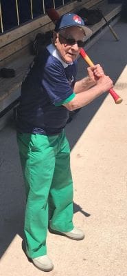 “Charlie Best, his Grandson Ethan, along with some of his family, came out to our game this past weekend. We had a great day and it was a pleasure meeting Charlie. He looks great for 95, he lives alone, still drives, and continues to golf and bowl. It was a treat as Charlie spent a good part of the day with us in the dugout.