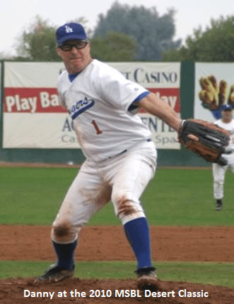 Danny has been pitching for about 18 years and has amassed somewhere in the vicinity of 320 victories. You can’t help but see him smiling and chucking in the MSBL World Series in Arizona for three weeks as well as in Las Vegas and Palm Springs, not to mention regional tournaments like the recent San Diego tourney.