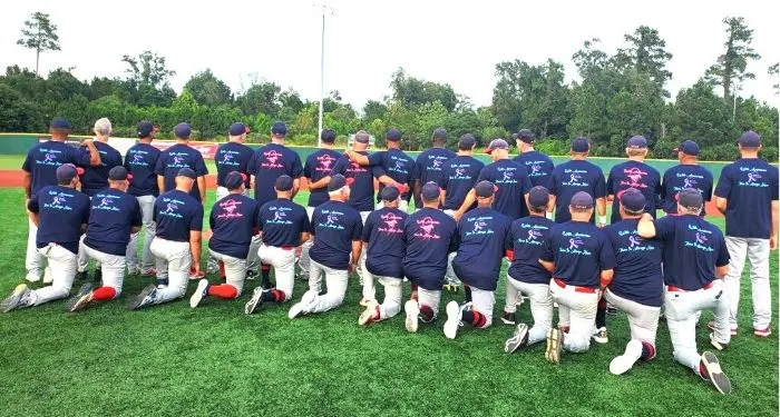 The Mustangs Baseball Club’s 53+ and 60+ teams recently came together to support two very worthwhile causes. The players donated funds to purchase for-cause dri-fit tee shirts to wear as warm-up shirts.